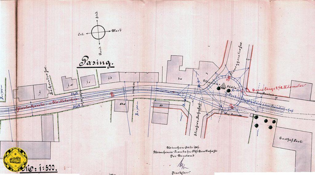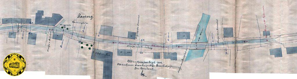 Der erste Plan einer projektierten Trambahn nach Pasing stammt vom September 1899. Das Faszinosum dieser Planung ist eine elektrische Eisenbahn nach Pasing, denn die Staatsbahn ist noch Jahrzehnte von der Elektrifizierung ihrer Strecken von München über Pasing nach Augsburg entfernt. Der vorliegende Plan aus dem 19.jahrhundert sieht noch ein Stumpfgleis vor für die Triebwagen mit 2-Richtungsbetrieb.