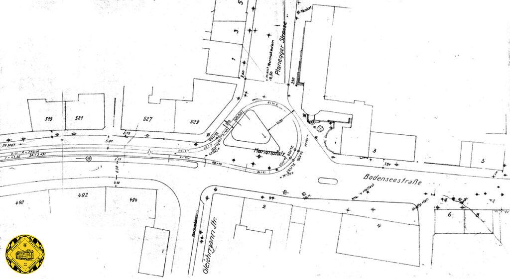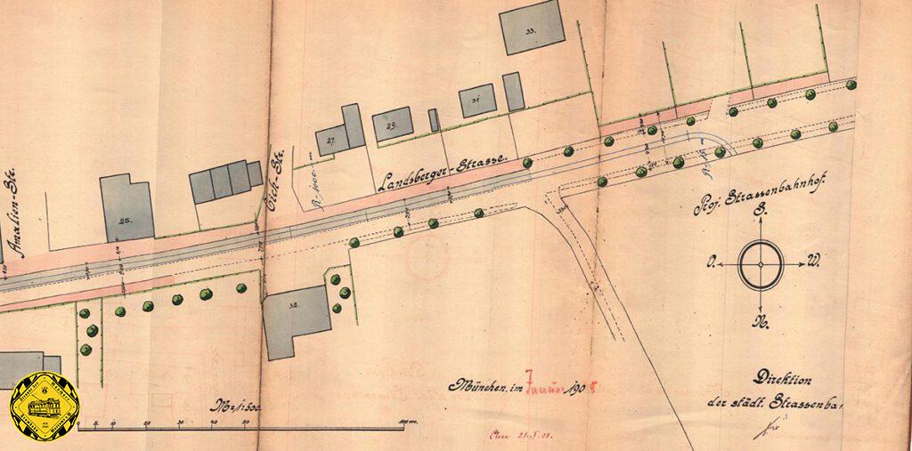 Die Planungen der Trambahn nach Pasing bekommt ungeahnte Varianten: eine davon ist 1906 die Weiterführung der Strecke durch die Planeggerstraße bis zur Gräfstraße. Andere Varianten führten durch die Landsbergerstraße, die aber bald wegen der Breite der Straße verworfen wurden. Es gibt auch Verhandlungen mit den Grundstücksbesitzern an der Gräfstraße, um dort die Straßenbreite zu erreichen , die für eine Trambahn nötig ist. Da es aber deutliche Widerstände in der Bevölkerung gibt und man nicht die Akzeptanz der Trambahn beschädigen möchte, wählt man die schräge Verbindung über den Feldweg zur damaligen Münchner Straße, heute „am Knie“. Dieser Plan zeigt sehr gut die damalige Bebauung rund um die geplante Streckenführung.