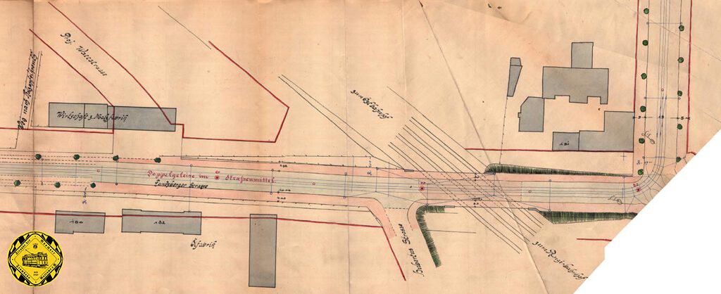 Hier sollte es nun ein Netz aus eine Güterbahn mit Meterspur werden, die beim drei-Schienenausbau der projektierten Trambahnstrecke nur eine weitere Schiene bräuchte. Verbunden werden sollten die sowohl die Kuvertfabrik beim Knie als auch die Arnold’sche Färberei und die Münchner Leistenfabrik. Durchaus imposantes netz aus Gleisen und Drehscheiben wurde geplant. Dazu gab es eine direkte Zufahrt zum Lagerhaus am Pasinger Bahnhof, und die Waren von und zu den Fabriken zu transportieren. Und wenn man schon hier eine Güterbahn baut, dann sollte sie auch gleich bis zur Pasinger Papierfabrik und dem gegenüberliegenden Gaswerk führen.
