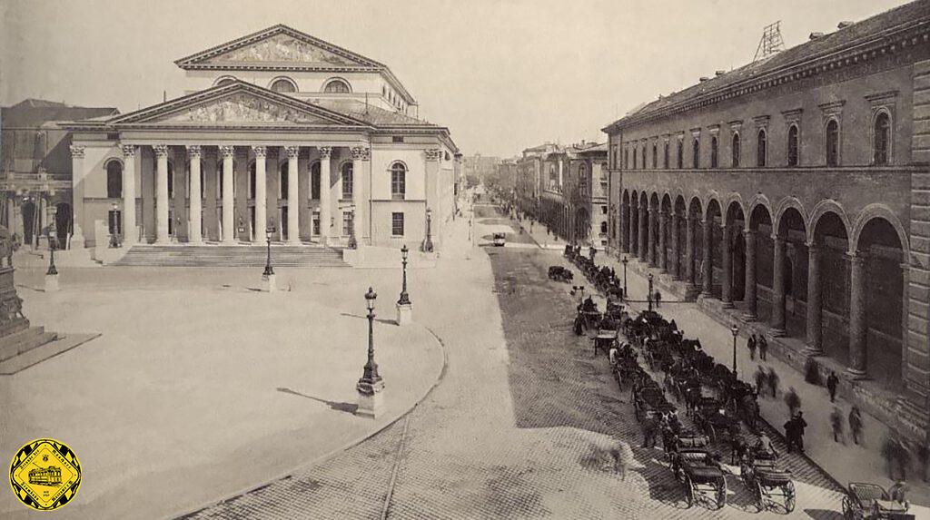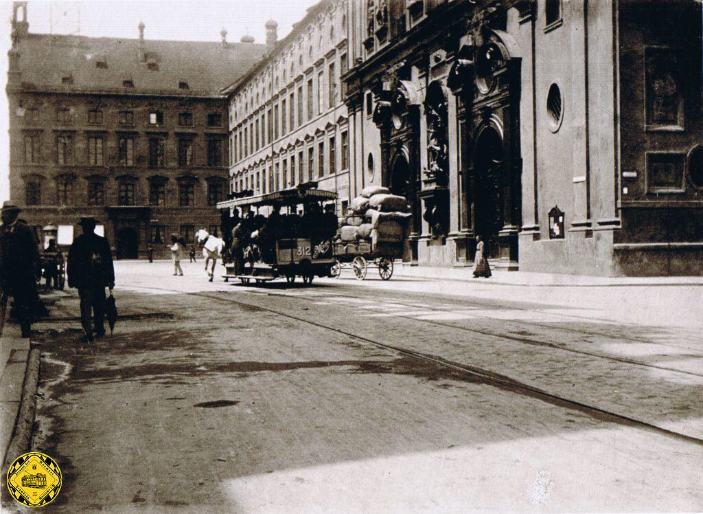 Am 16.September 1882 geht die neue Pferdebahnstrecke vom Hoftheater über Maximilianeum und Max-Weber-Platz zum Ostbahnhof in Betrieb. Die Strecke endet neben dem Hoftheater stumpf. Es gab keinen Prellbock oder ähnliches: die Pferde wurden umgespannt und es ging wieder zurück zum Ostbahnhof. Weiter in die Innenstadt konnte man, – wenn man es sich leisten konnte, mit den vor der Residenzpost bereitstehenden Kutschen-Diensten.