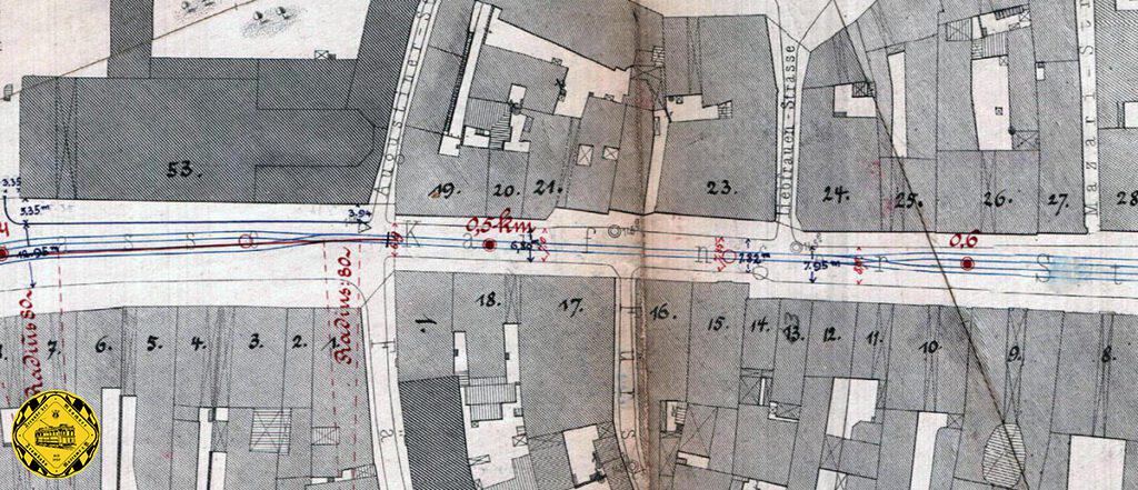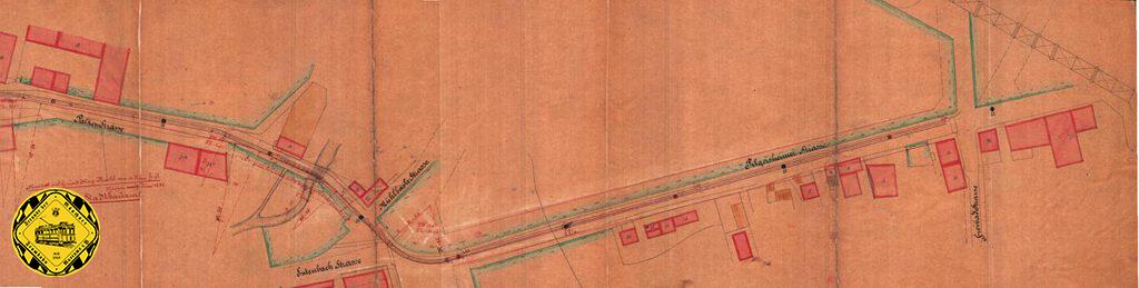 Der Plan vom 13.Juni1882 zeigt die Streckenplanung der kompletten Strecke. Wenn man schon die Originalpläne hat, muss man sie auch komplett zeigen. Die Strecke war eingleisig in der schmalen Falkenstraße. Der nördliche Verlauf der Falkenstraße war deutlich anders als heute und führte an der Paulanerbrauerei vorbei.