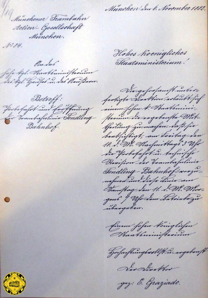 Dieses Schreiben vom 29.März 1882 bestätigt den Bau der ersten Bahn-„Unterfahrt“ in München in der Lindwurmstraße, die auch von einer Pferdebahn genutzt wird. Damit das Problem gelöst, wie man eine vielbefahrene Eisenbahnstrecke kreuzt.