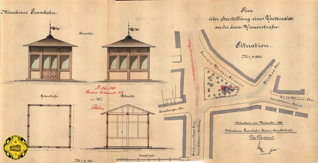 Mit dieser neuen Strecke wird der Max-Weber-Platz zu einem Umsteigepunkt bei der Münchner Pferdebahn und es wird eine Wartehalle geplant und 1889 errichtet. Rechts kann man auch den Gleisplan des Max-Weber-Platz gut erkennen: die Hinterstellgleise rot im Plan verzeichnet in die heutige Einsteinstraße wurden ab der Übernahme des neuen Betriebshofs an der Äusseren Wienerstraße im Oktober 1890 die Zufahrtsgleise zu diesem Depot.