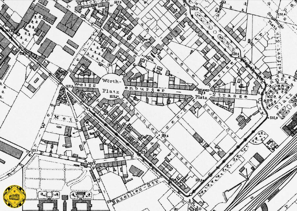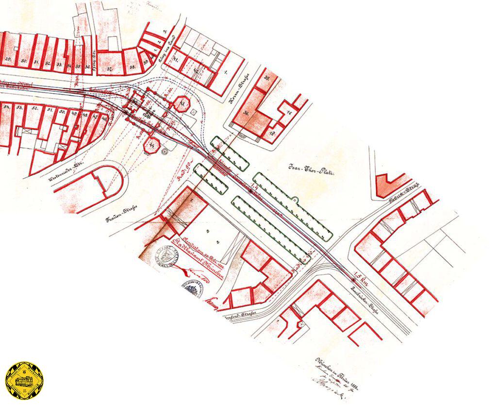 Dieser Plan vom 22.Februar 1888 zur Entscheidungsfindung, wie man um oder durch das Isartor kommt und ob man es umbaut und die Torbögen vergrößert, zeigt, wie damals um diese Gleisführung gerungen wurde. In diesem Plan ist auch die eingleisige Strecke in die Thierschstraße gut zu sehen.