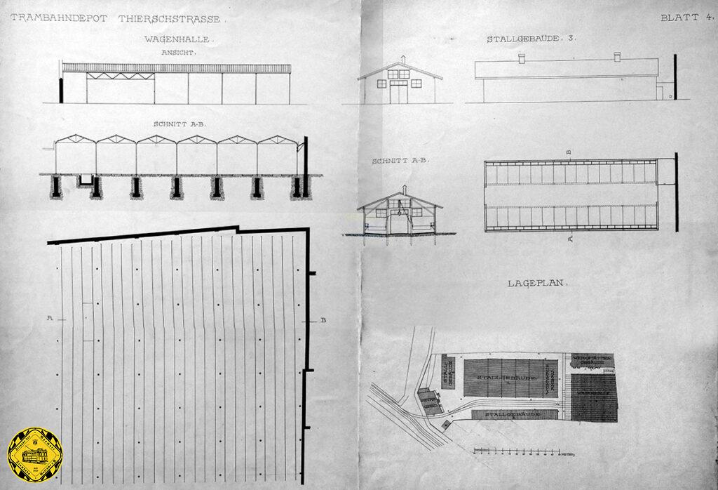 Betriebe 16 Wagen erforderlich sind, eine größere Wagenhalle unumgängliches Bedürfniß, endlich muß ein großes neues Magazin für Heu und Strohvorräte gebaut werden; auch ist für Aufsichtsorgane de Gesellschaft in fraglichem Depot ein Wohnhaus mit 2 Wohnungen zu errichten.“