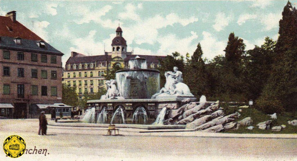 Die Pferdebahn fuhr links am von 1893–1895 gebauten Wittelsbacher Brunnen herum zum Karolinenplatz. Zum Zeit dieses Bildes war der Brunnen gerade neu. Als die Pferdebahn eröffnet wurde im Jahre 1882 gab es also diesen Brunnen noch gar nicht.