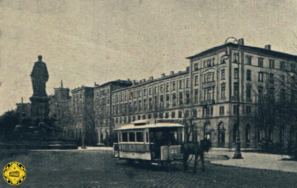 Ein Pferdebahn-Wagen der weissen Linie fährt über den Platz am Maxmonument, das erste Bild einer Pferdebahn hier.