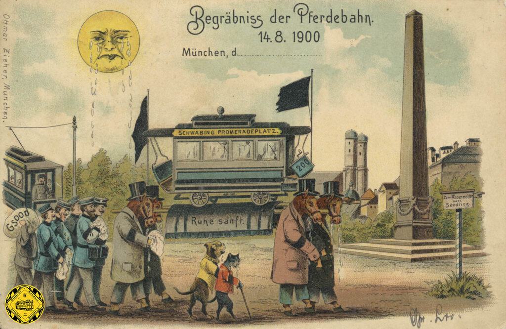 Alte Postkarte zur Einstellung der Pferdebahn 1900