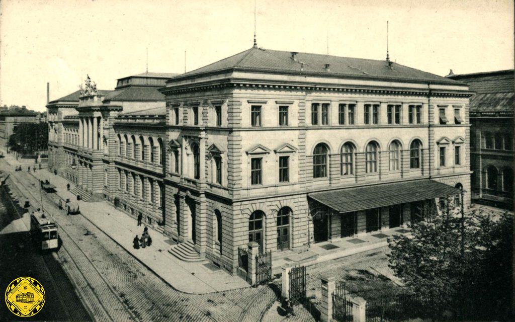 Die Trambahn ist elektrisch in der Bayerstraße und führt schon nach Westen bis zur Barthstraße. Schon seit 1899 wird an einer neuen Überladstrecke nach Pasing geplant, die aber erst am 16.12.1908 eröffnet wird. Unser Bild stammt aus dem Jahr 1906 und zeigt die Bayerpost und die gepflasterte Einfahrt der Posttrambahn. Rechts an die Bayerpost anschließend ist das Haus der Frachtabteilung der Bahnpost zu sehen, das zeitgleich mit der Bayerpost gebaut wurde.