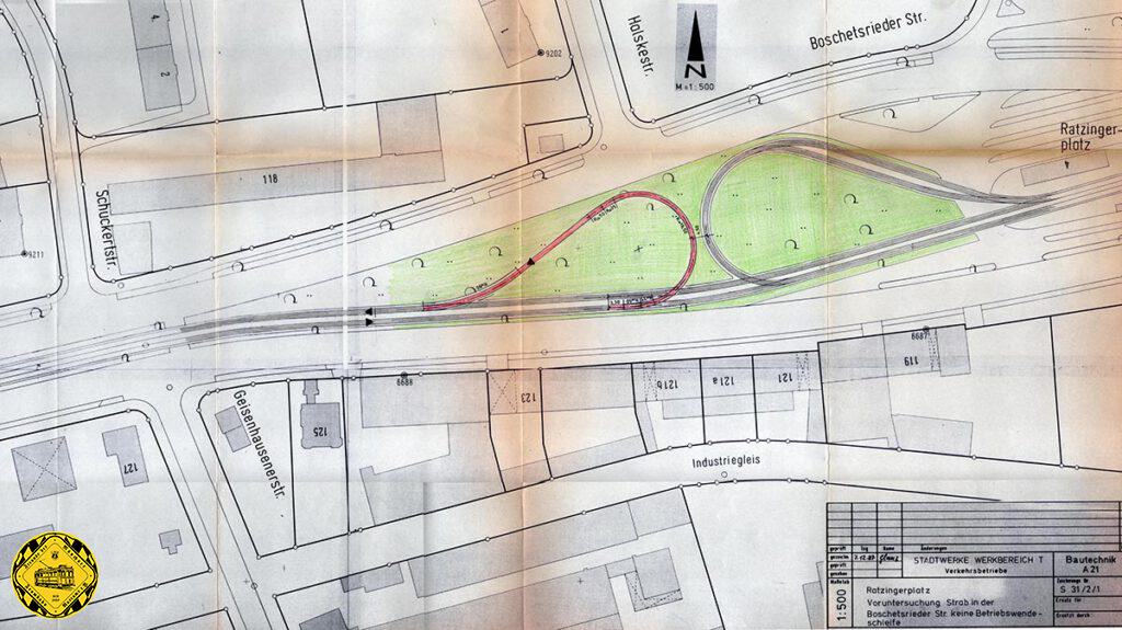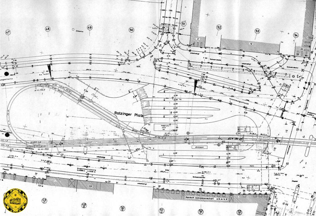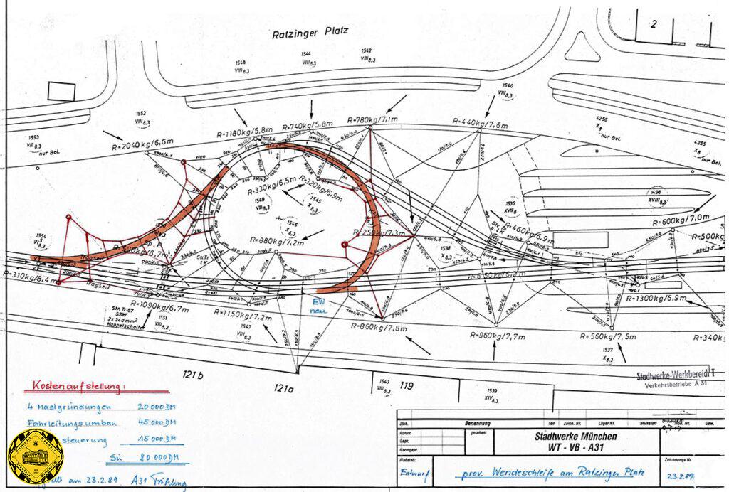 Ungewohntes Bild des Ratzinger Platz mit den verschiedenen eingezeichneten Umbaupläne vom 23.2.1989 für die Umkehrschleife aus Richtung Fürstenried.