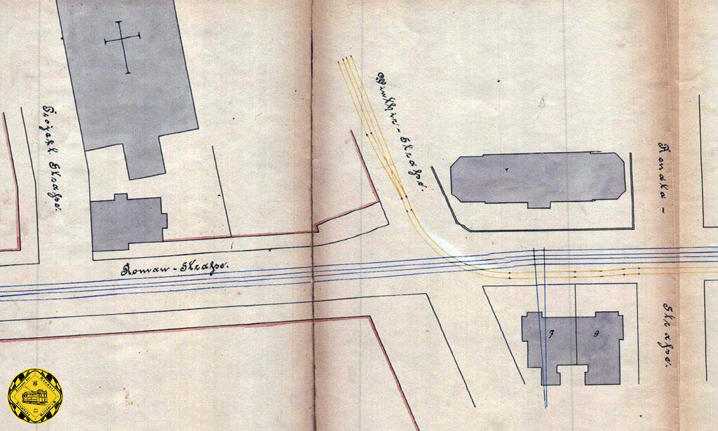 Ein weiterer Ausschnitt aus dem Plan von 1898 zur Legung neuer Gleise für den elektrischen Betrieb. die Gleislegungen waren damals nötig, weil man gleichzeitig zu dem neuen Schienentyp „Phönix“ umstieg. Die 1880 auf den Markt gekommenen Phönix-Schienen waren aus einem Stück und hatten konstruktionsbedingt schmälere Rillen. Außerdem mussten für den elektrischen Betrieb die Schienen elektrisch leitend verbunden werden. Weiter konnten Pferdebahn-Schienen oft nicht das Gewicht der neuen Triebwagen tragen und der gesamte Unterbau musste ersetzt werden. Die bisher verwendeten Hartwich-Schienen, die aus zwei Schienen verschraubt werden mussten, wurde allerdings oft für wenig genutzte Hinterstellgleise wiederverwendet, wo nur leichtere Beiwagen abgestellt waren.
