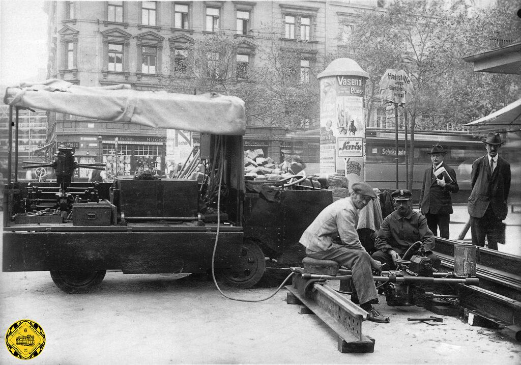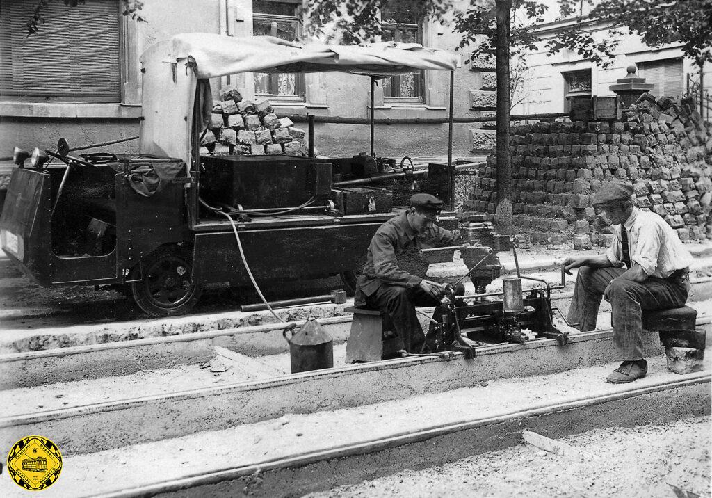 Gleisbauarbeiter im Jahr 1933 bei der Vorbereitung einer Thermit-Schweißung. Bei Gleisen, die eingeflastert waren, musste oft erst Berge von Plastersteinen entfernt werden, um an die Gleise zu kommen. Die Pflastersteine waren Aufgabe des Städtischen Bauamts, was eine genau Koordinierung mit dem Schienenbau vorraussetzte.