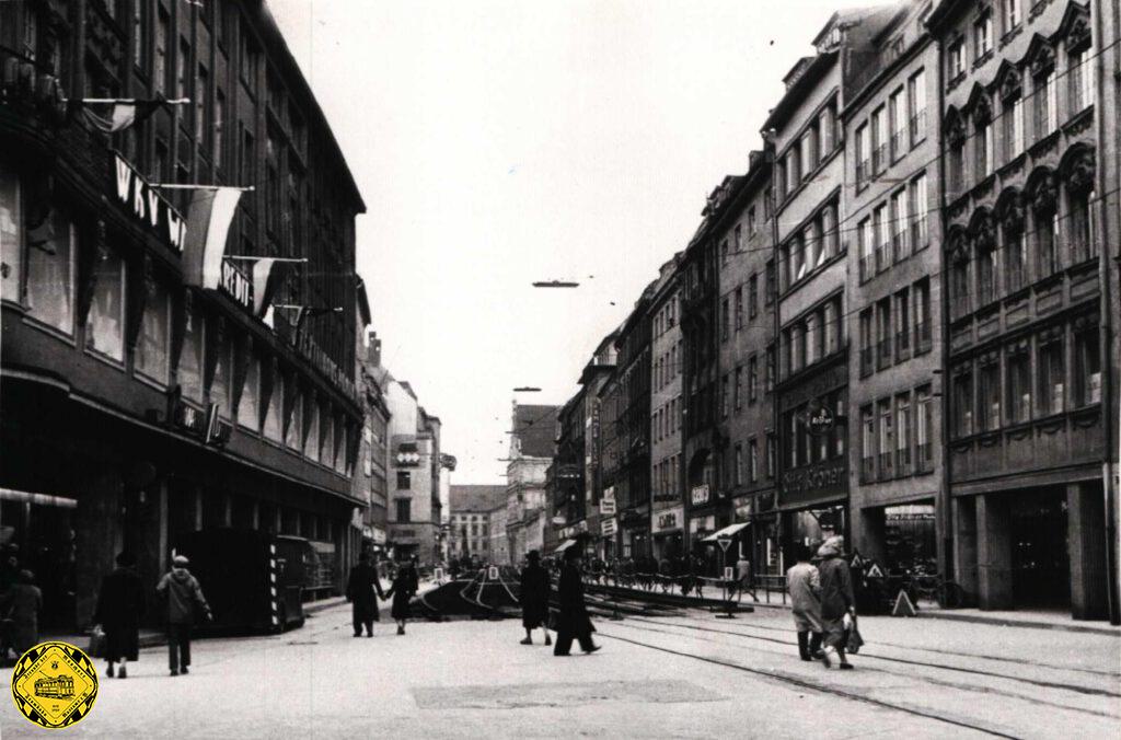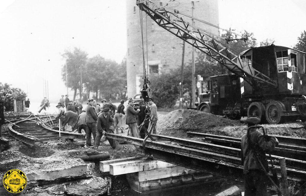 Nach dem Krieg war die Lindwurmstraße eine unvollendete Baustelle, wie das Bild rechts zeigt. Erst 1950 wurden die Gleise wieder zurück in die Mitte gelegt. rechts sieht man die Gleise der Schuttbahn zur Neuhofer Schütt.