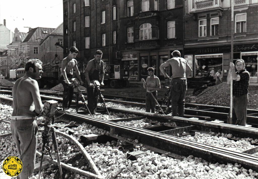 Gleisbau hieß immer, entweder Neubau einer Strecke, Ersatz von Schienen und deren Austausch oder Verlegung der Schienenwege. Hier in der Einsteinstraße blicken wir stadteinwärts auf die spätere Kreuzung mit der Richard-Strauss-Straße, der Betriebshof 2 ist noch in der Seeriederstraße. Hier werden die Gleise gerade im Zuge der Verbreiterung der Einsteinstraße zum Vogelweideplatz umgelegt.