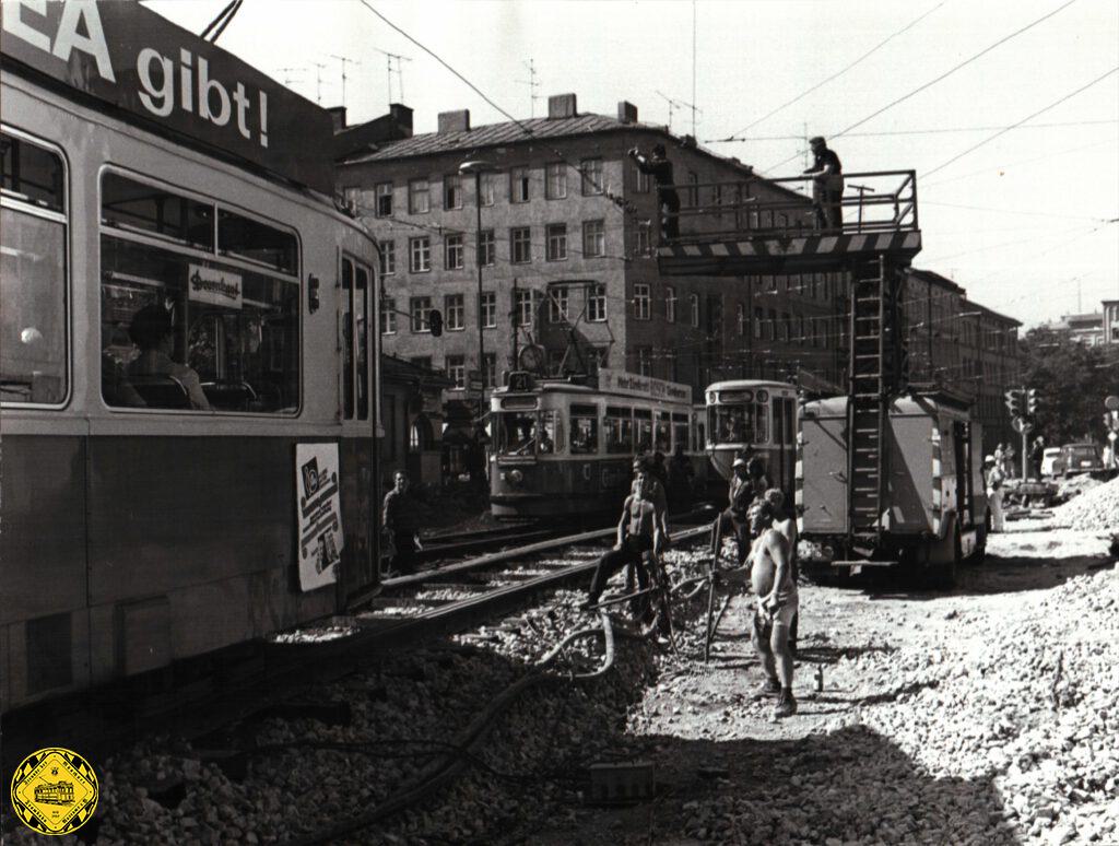 Gleisbaustelle an der Kreuzung Orleansstraße und Berg-am-Laim-Straße zur Unterführung unter dem Ostbahnhof. Auch damals wurde der Verkehr nicht eingestellt und monatelanger Schienenersatzverkehr per Bus organisiert, sondern unter rollendem Rad gearbeitet.