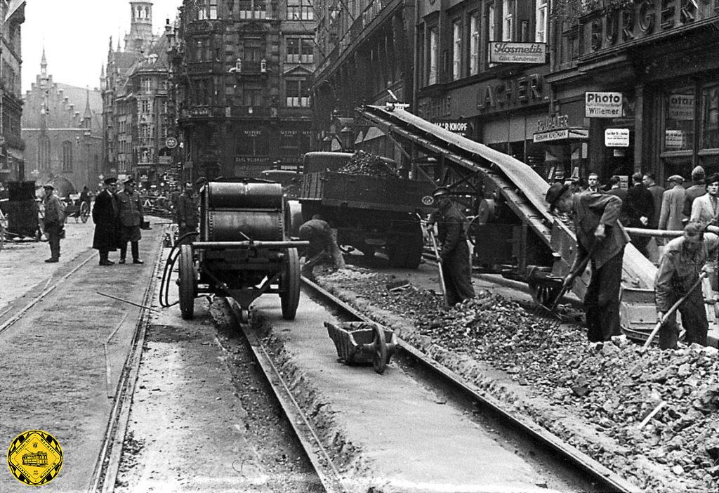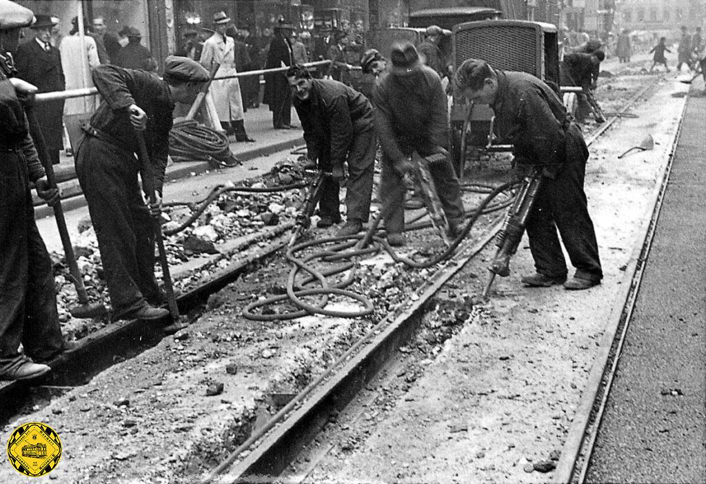 Die besonders stark frequentierten Strecken wie hier die durch die Kaufingerstraße zum Marienplatz benötigten wie hier in den 1930er-Jahren öfter eine Gleiserneuerung. Dabei wurde nach und nach auch die alte Holzschwellen-Bauweise durch einziehen von Betonplatten abgelöst.