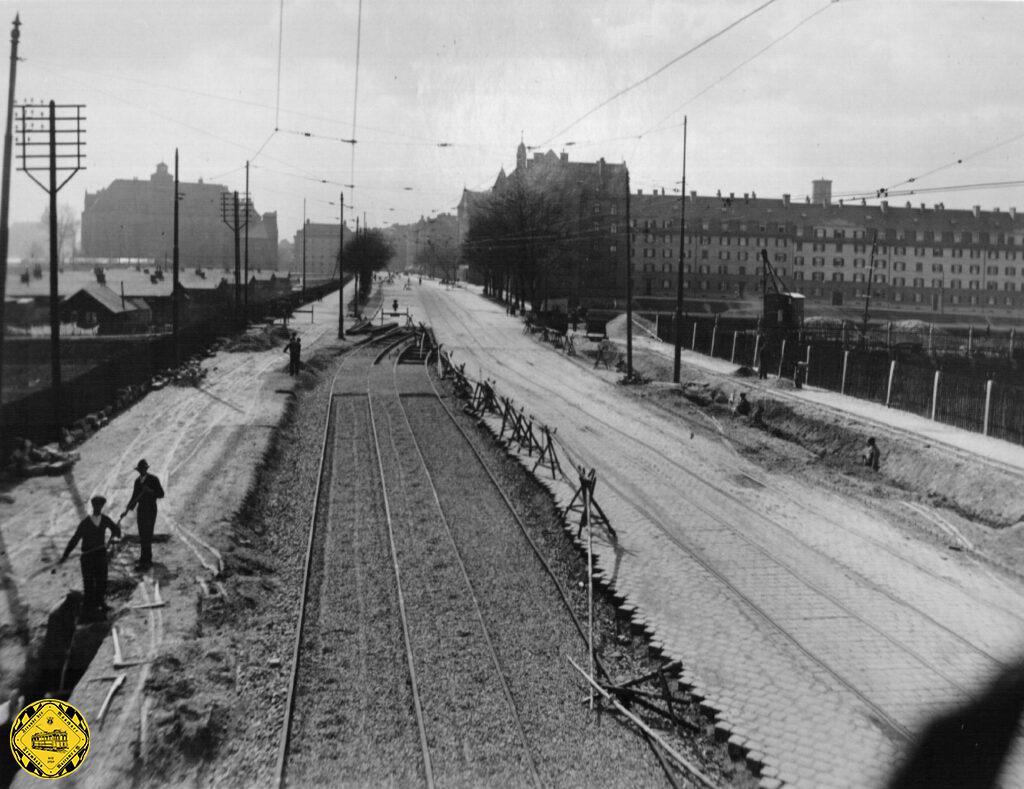 Es gibt nur wenige Bilder vom U-Bahnbau vor dem 2.Weltkrieg. hier schaut der Fotograf von der Kreuzung der Lindwurmstraße mit der Reisingerstraße Richtung Süden: die Trambahngleise sind bereits verschwenkt und der Aushub für den Tunnelbau beginnt.