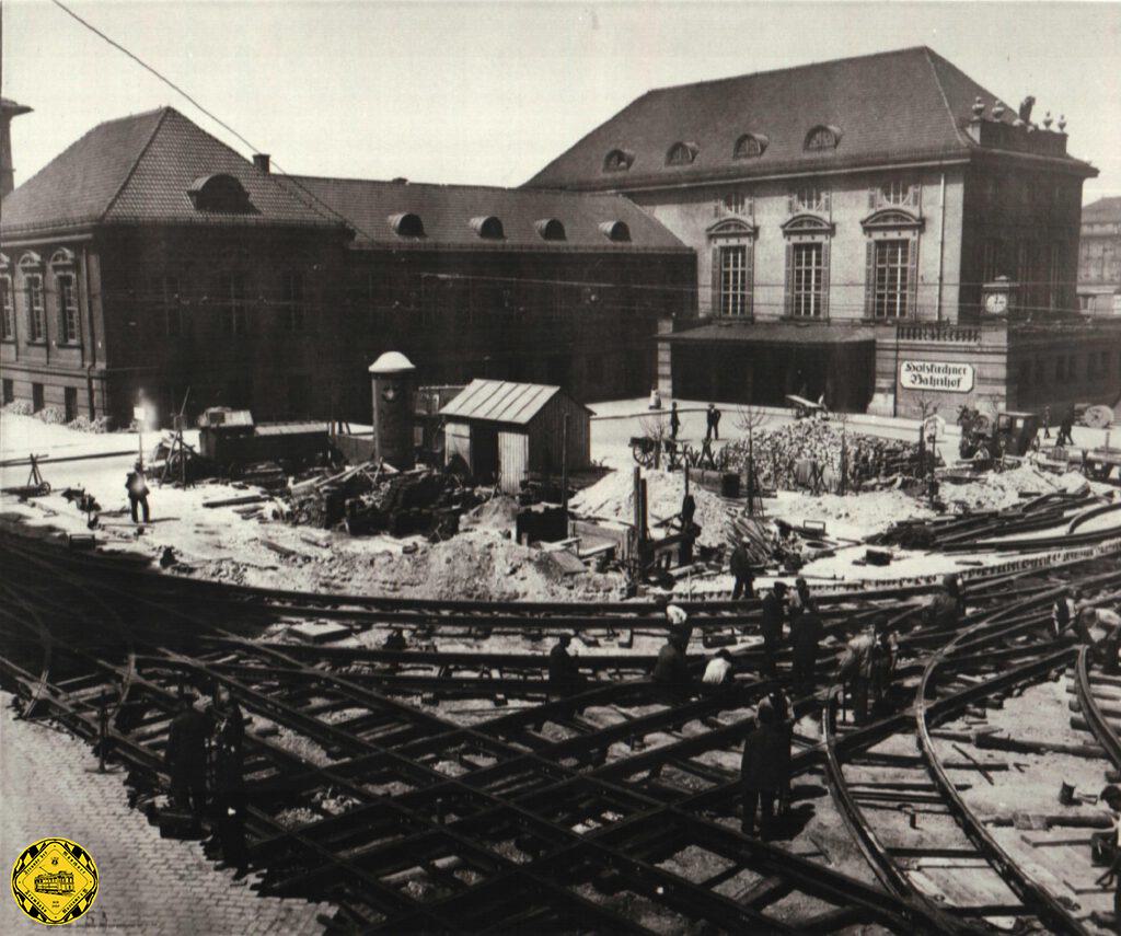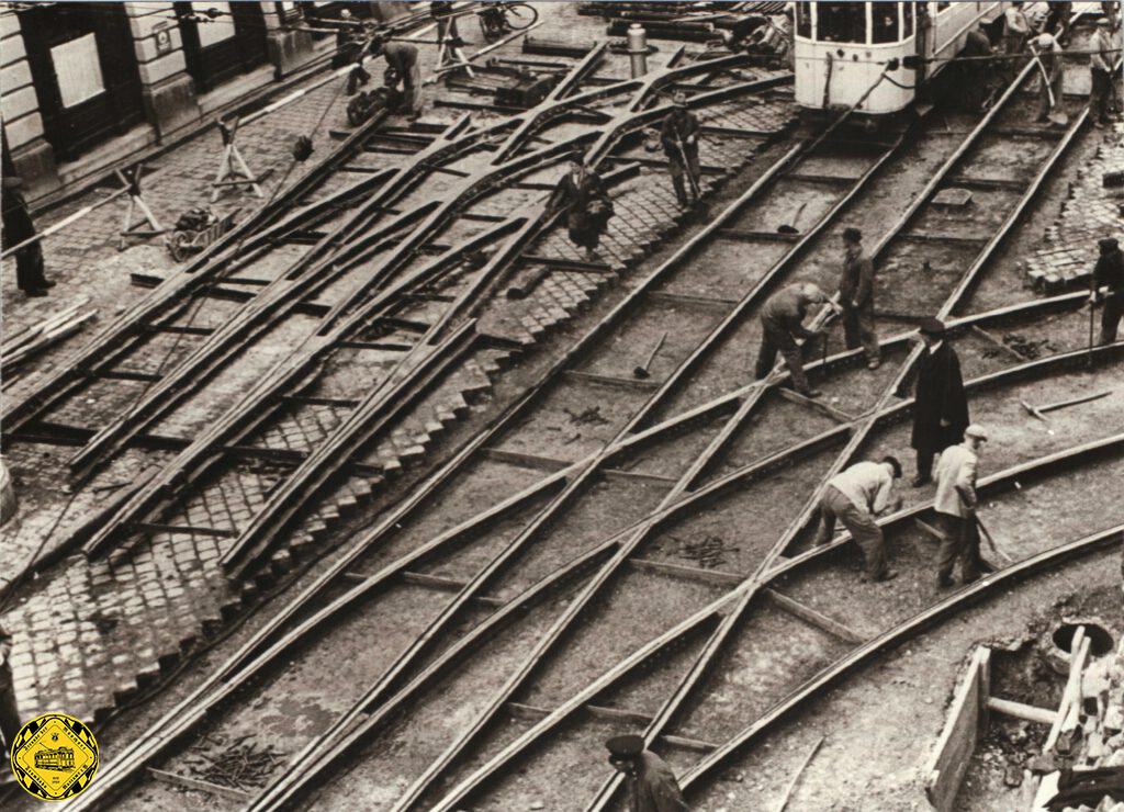 In der Vorkriegszeit wurden auch komplexe Kreuzungen und Abzweige wie hier der an der Müllerstraße und Fraunhoferstraße in Bauteilen komplett vorher erstellt und dann am Stück ausgetauscht: da es wenig Autoverkehr gab, konnte man sich mit seiner Baustelle gut ausbreiten neben den noch befahrenen Gleisen.