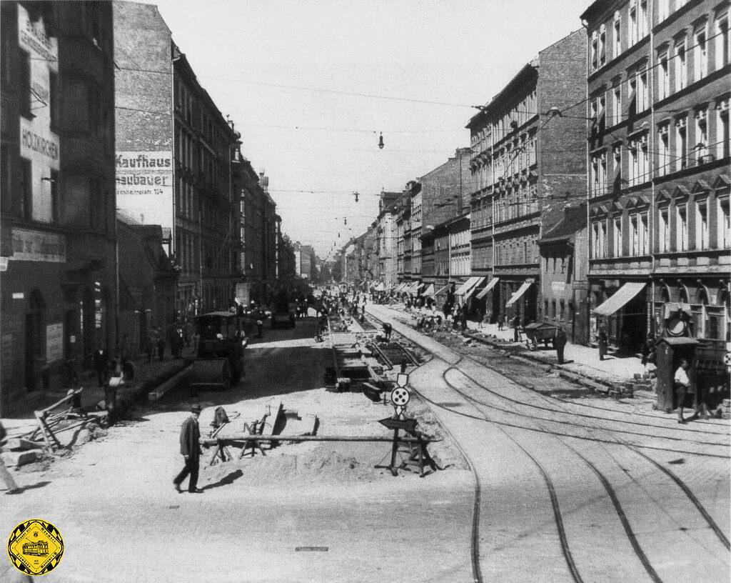 Gleisbaustelle Ende der 30er-Jahre in der Lindwurmstraße: zum Bau der U-Bahn der Reichsbahn sind die Gleis auf die Straßenseite verschwenkt worden, um für die Aushubarbeiten Platz zu schaffen.