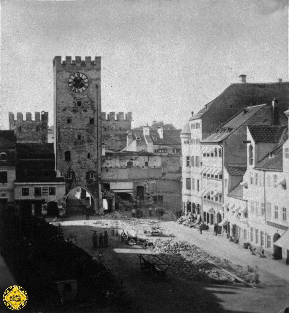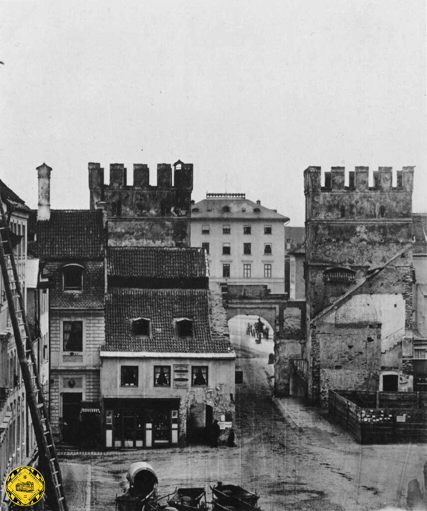 Das Jahr 1857 veränderte das Karlstor: die Schwarzpulver-Bestände, die im Nebenhaus des Turms des Eisenhändlers Rosenlehner gelagert waren, expoldierten am 15. September 1857 und beschädigten diesen so sehr, dass dieser später abgerissen werden musste. Die beiden Flankentürme wurden umgestaltet und später mit einer neuen Brücke (neugotisch) verbunden, 1861 bis 1862 von Arnold Zenetti gestaltet.