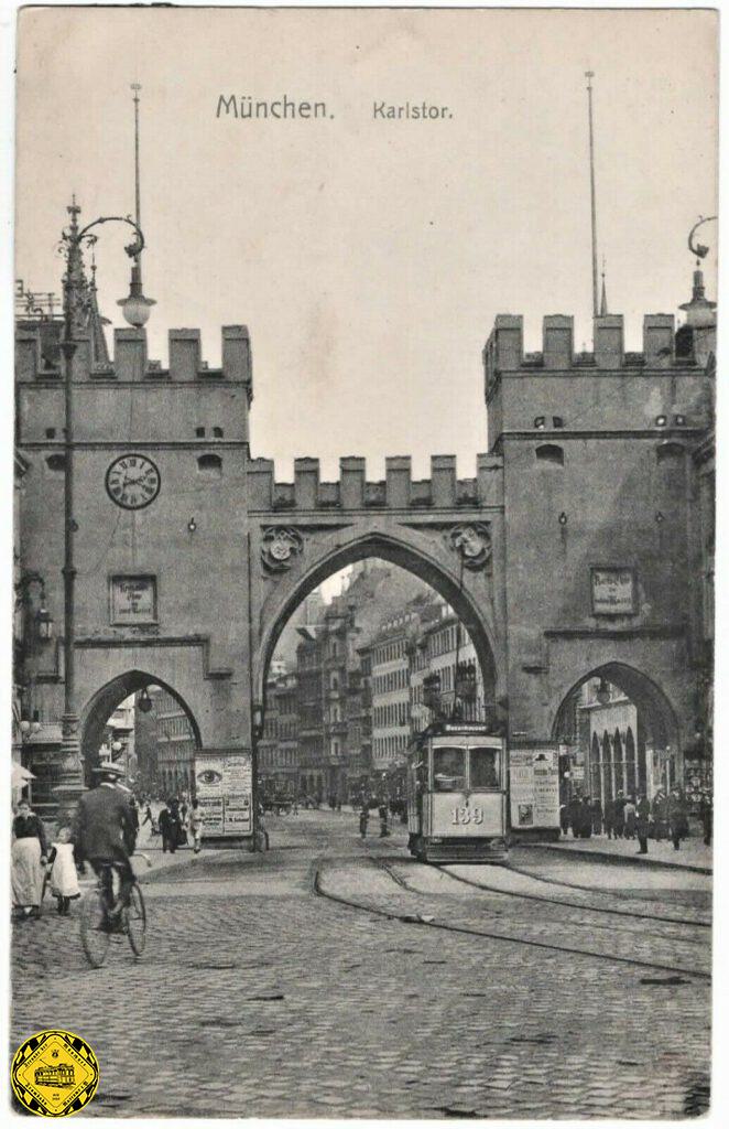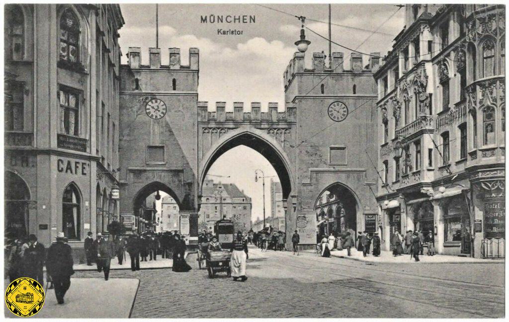 Das Karlstor und die Trambahn: die erste stadtdurchquerende Linie fuhr ab dem 16.06.1888 auf der Strecke Karlsplatz – Neuhauserstraße – Kaufingerstraße noch als Pferdebahn.