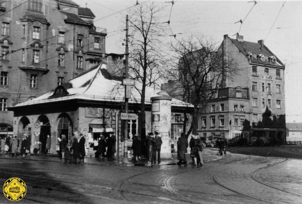 Kurz nach dem Krieg kommt der TW 2001, ein „Römer“ auf der Linie 12 noch mit Stangerl vom Herkomerplatz auf den Max-Weber-Platz. Das Stationshaus hat den Krieg unversehrt überstanden. Allerdings sieht man gut, dass der südliche Bogen des Vorbaus zu einem Zeitungskiosk umgebaut wurde.