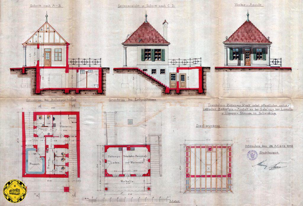 Der erste Entwurf für so ein Stationshaus zeigt schon, dass aus Platzproblemen auf dem Feilitzschplatz die Toilettenanlage unterirdisch ausgeführt werden könnte. Das quadratische Häuschen an der Oberfläche wurde relativ klein gehalten.