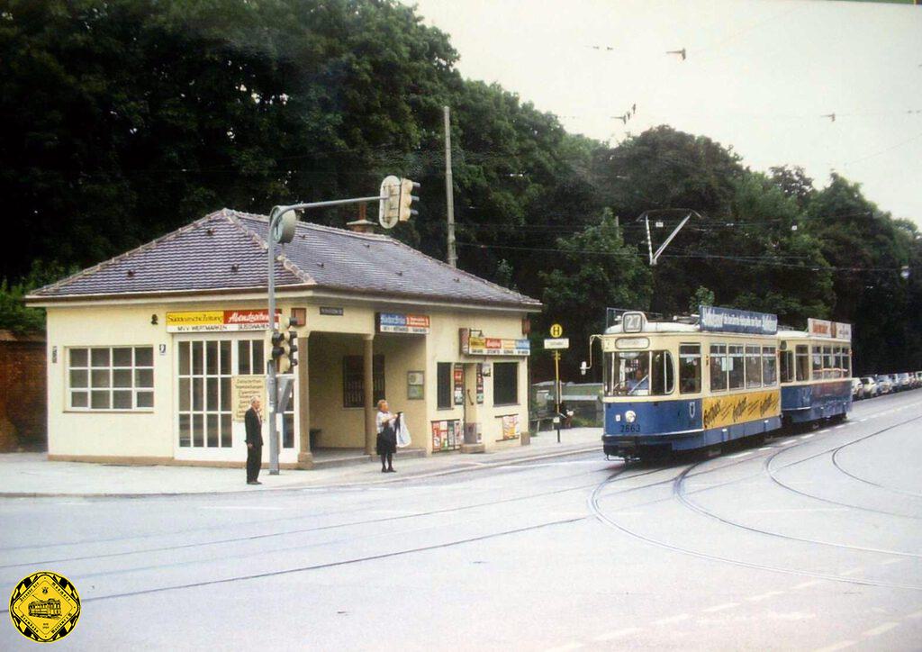 Im Jahr 1944 am Ostfriedhof: der Trambahnverkehr ist nur begrenzt möglich, das Stationshaus kann nicht mehr in Betrieb gehen. Es wird 1945 abgerissen.