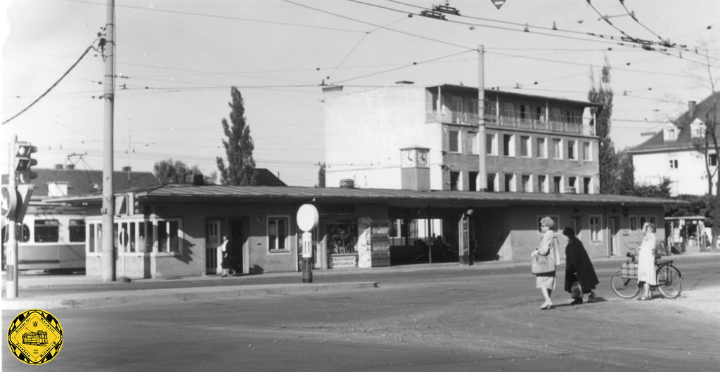 Nach der zweite Wartehalle mit Kiosk wurde 1951 das große Stationshaus gebaut, das auch in den 60er-Jahren die große Funkstation für diesen Stadtteil bekam. Das Bild wurde am 9.September 1959 aufgenommen mit den Oberleitungen für den O-Bus, der damals eine Schleife aus der Fürstenriederstraße in die Haltestellenanlage Waldfriedhof besaß.