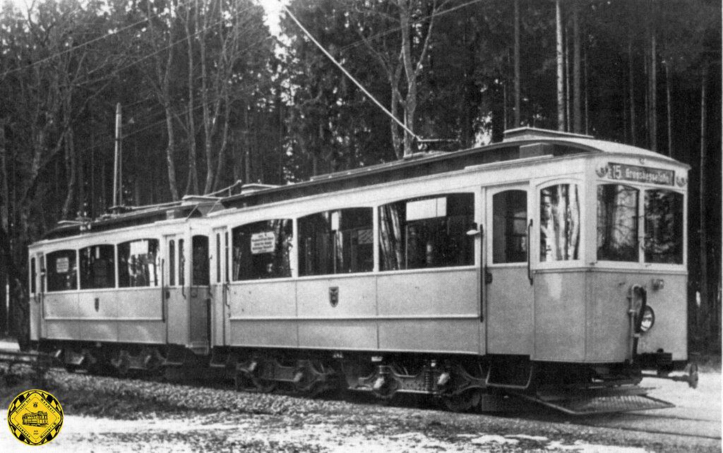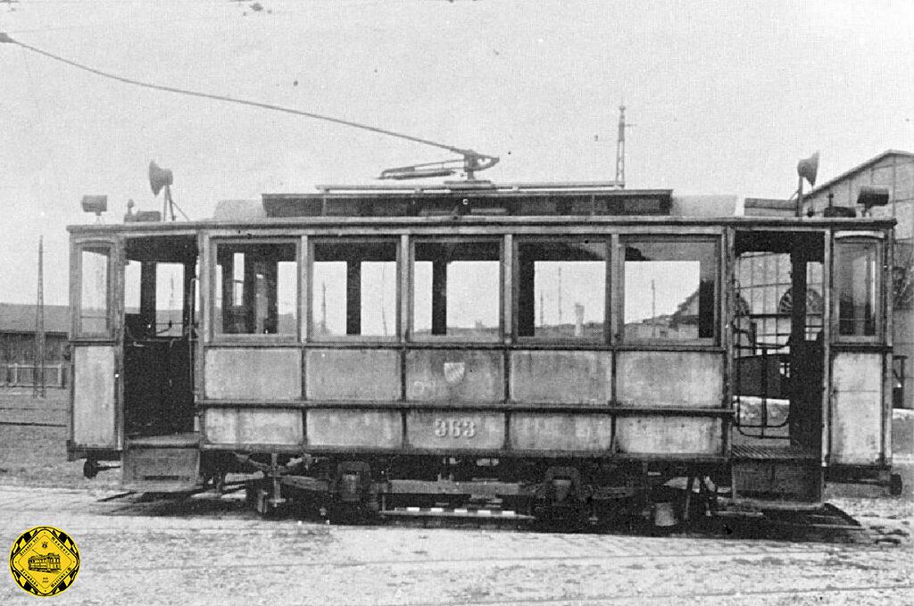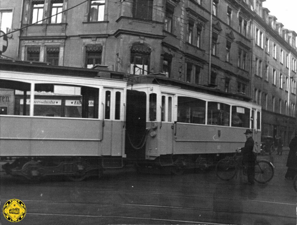 Der TW 352, der den Krieg überlebte, fuhr noch bis 1954 ohne Übergänge zwischen den beiden Wagenhälften und ohne Faltenbalg mit geschlossenen Plattformen.