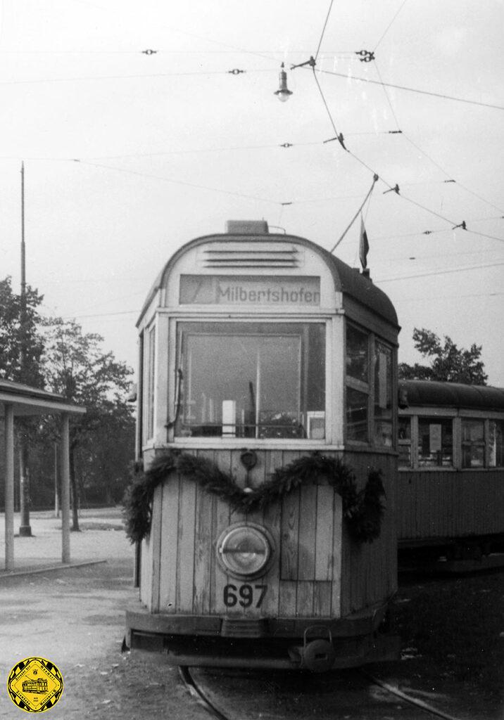 Im August 1946 zeigt sich der K 2.10-Triebwagen 706 noch weitgehend im Ursprungszustand in der Wendeschleife Berg-am-Laim. Lediglich die ursprünglich aufgebrachte braune Tarnfarbe des 1944 gebauten Fahrzeugs wurde durch ein freundliches, frisches Weiß-Blau ersetzt.