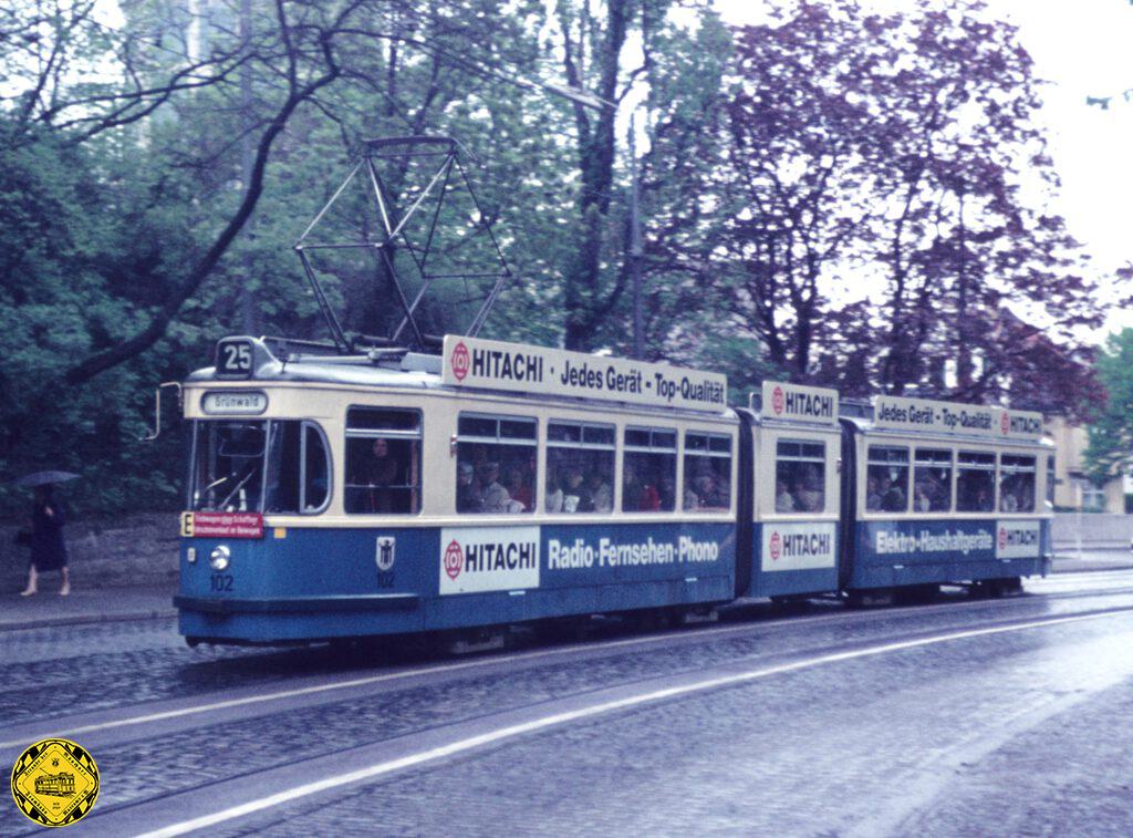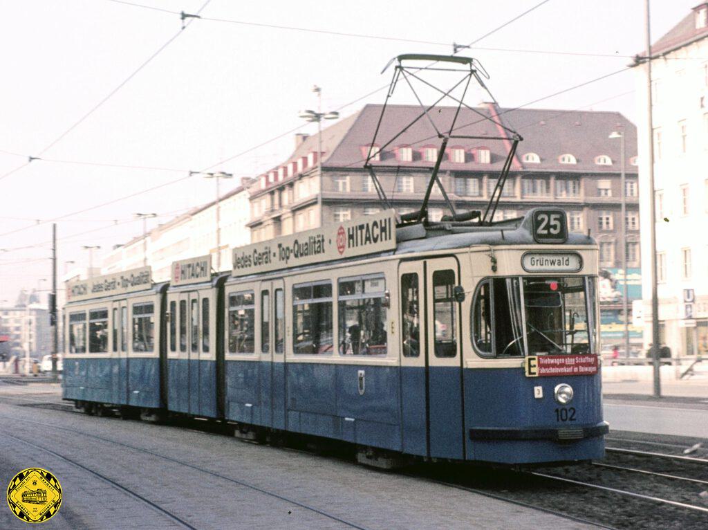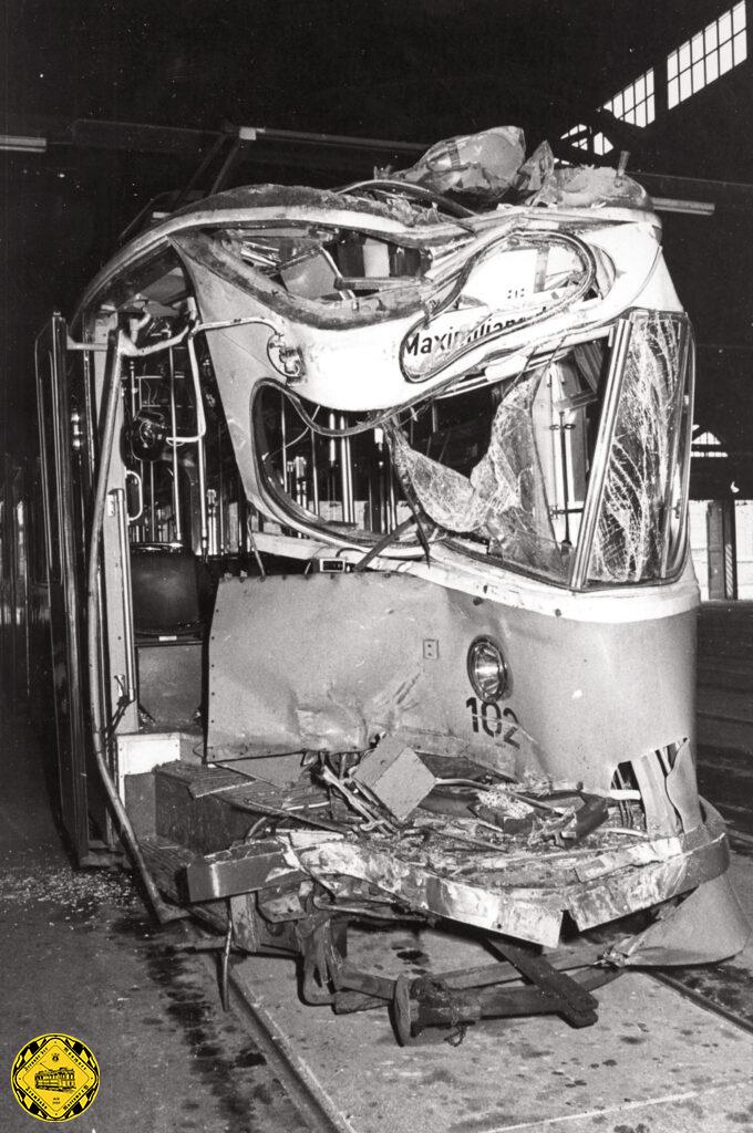Am 22.11.1970 erlitt der Tw 102 einen schweren Zusammenstoß, wobei die vordere Plattform komplett zerstört wurde. Zunächst plante man, den Wagen auszuschlachten, jedoch war er erst im August 1968 einem weitreichenden Umbau unterzogen worden. Hierbei war auch die ursprüngliche Kiepesteuerung durch ein Siemens-Schaltwerk ersetzt worden. Wider Erwarten wurde der Triebwagen daher zur Freude der Münchner Tramfreunde wieder instandgesetzt.
