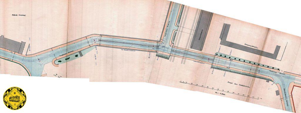 Hier kommt der Zug aus der Unterführung und fährt weiter Richtung Süden zur Neuhofer Schütt, wie das Gebiet damals genannt wurde.