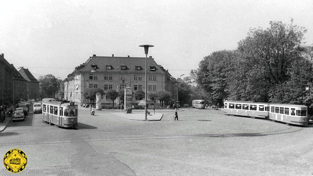 Drei M-Wagen am 17.5.1960 in der Schleife am Herkomerplatz. Heute erinnert hier nichts mehr an diese Verkehrsführung, nur die kultige Uhr ist heute noch ähnlich erhalten. Nach links aus dem Bild führt das damalige Hinterstellgleis am Herkomerplatz.